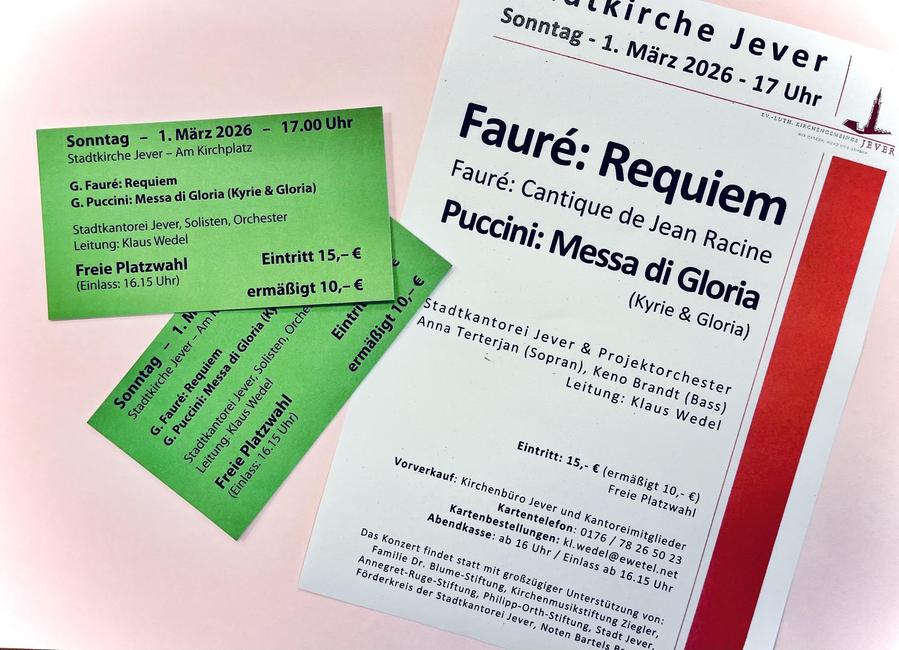 Vorverkauf bei Kantor Klaus Wedel (017678265023), im Kirchenbüro und bei Kantoreimitgliedern.