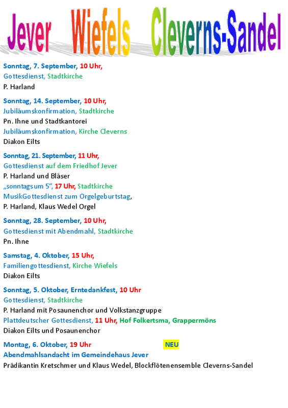 Gottesdienste im September/Oktober 2025 in Jever-Wiefels-Cleverns-Sandel